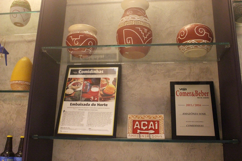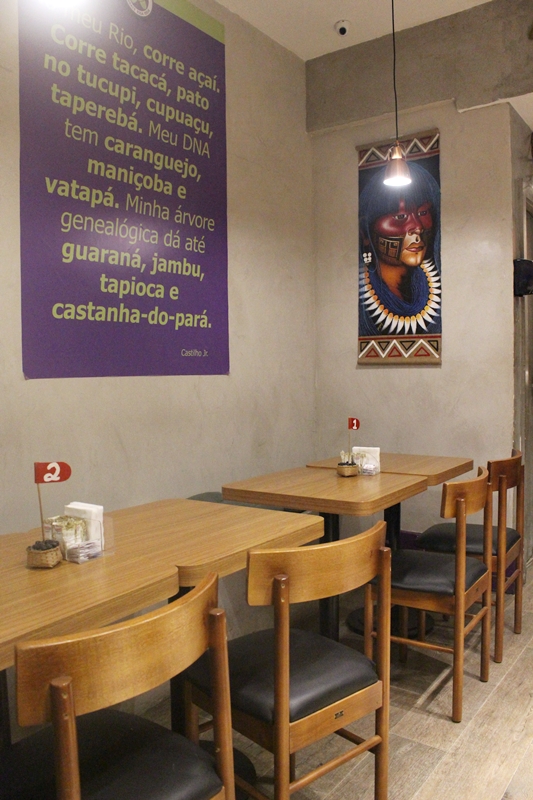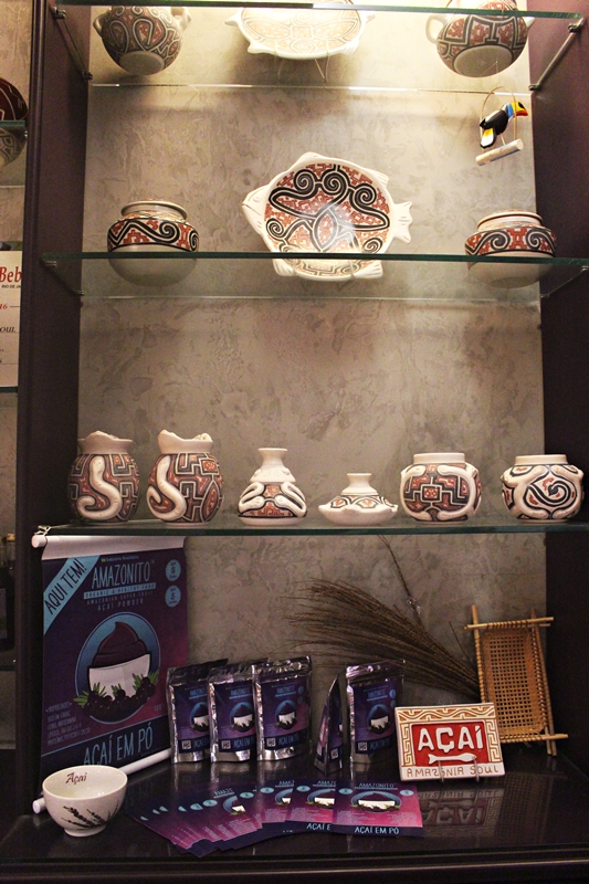 O bistrô é pequeno, mas muito charmoso. As cores lembram o açaí e a decoração traz objetos indígenas de várias etnias diferentes e que estão a venda, pois a Amazônia Soul funciona como um empório e lojinha também, um máximo!