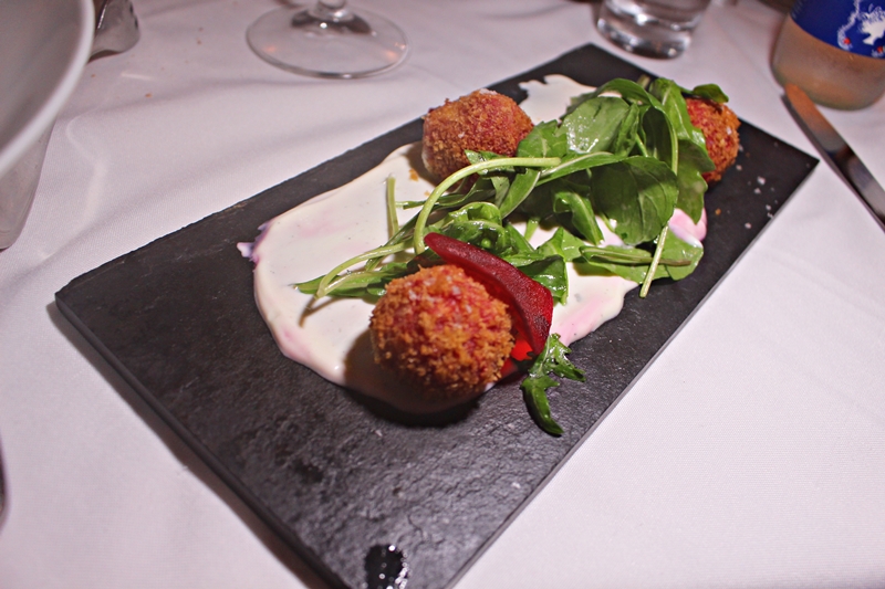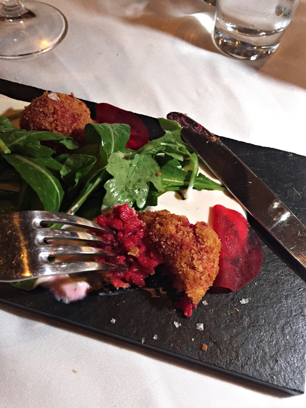 Salada Niçoise - Salada Beterraba com Queijo de Cabra – arancini de beterraba (leia bolinha de queijo de cabra roxa, vulgo, melhor coisa da vida!), picles de beterraba, fromage blanc e vinagrete de mel e mostarda. O arancini merece reverências de tão bom que tava!