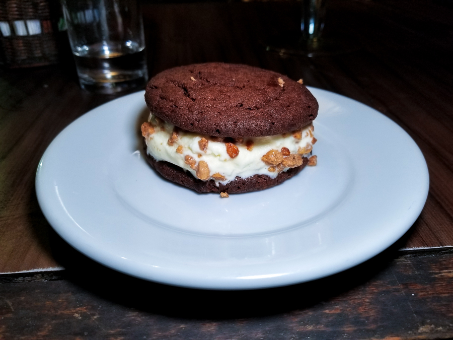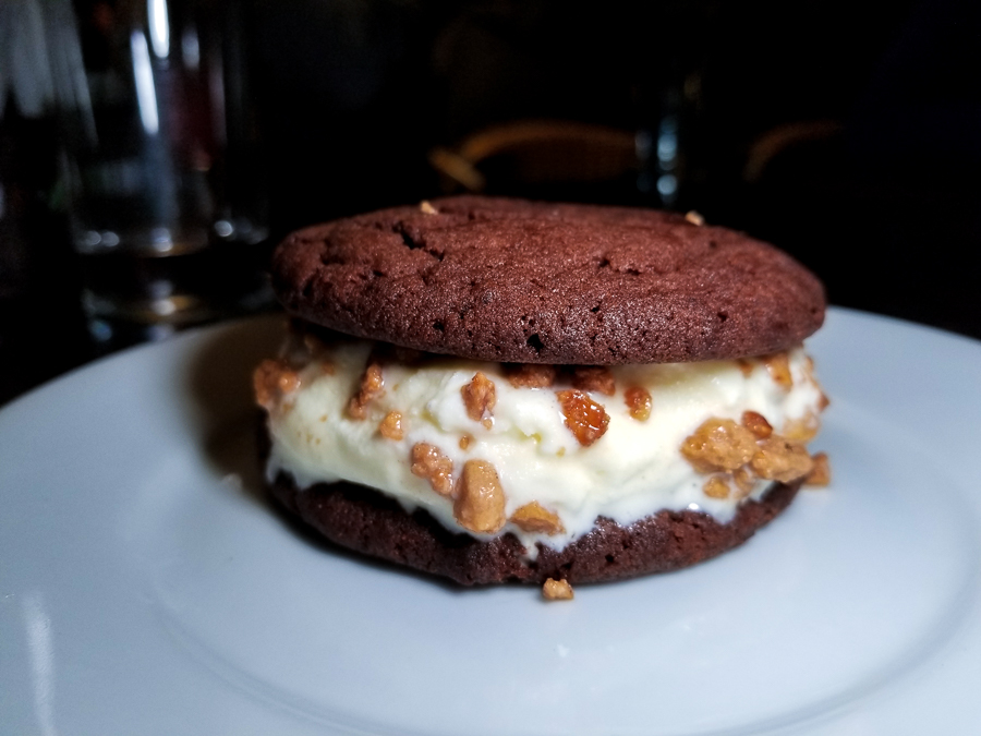 Por fim, fomos a sobremesa também feita pelo chef Pedro: o Cookie Sandwich (R$22,00). São dois cookies artesanais (receita do chef) com sorvete de baunilha no meio e farofa crocante por cima. Uma maravilha.