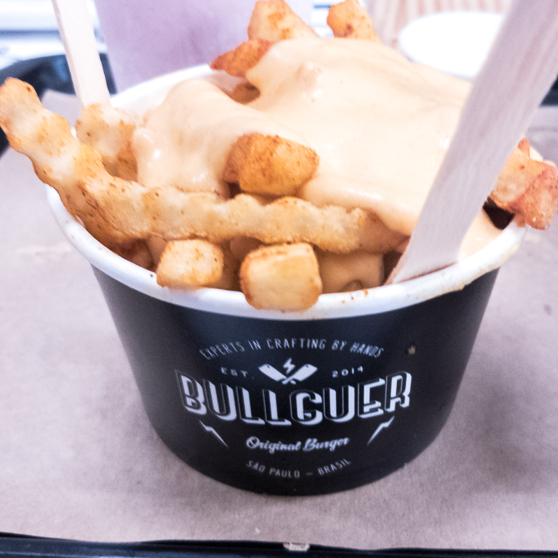 O hambúrguer da Bullguer Botafogo segue a linha dos “smash burgers“ americanos (Shake Shack e afins). A preparação é colocando a carne, 100% Angus, em formato de uma bola diretamente na chapa e a amassando com a espátula. Tal método garante características únicas aos burgers, dizem os especialistas no assunto (e a gente concorda também).