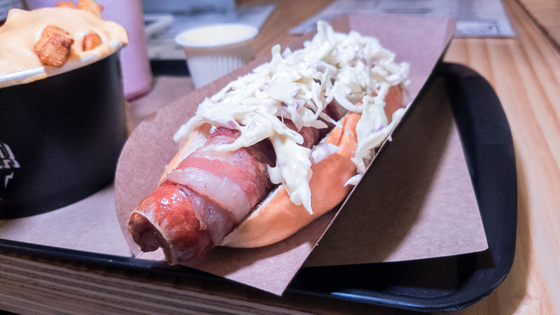 Pedimos também o Bulldog para matar a curiosidade e nos surpreendemos. Geralmente quando vamos a uma hamburgueria queremos comer o hambúrguer, mas posso garantir que se você fizer a escolha pelo Bulldog não irá se arrepender. O Bulldog custa R$18,00 e vale cada centavo. O pão é muito bom, a salsicha com bacon enrolado também e para coroar: a saladinha de repolho ColeSlaw, que delícia de combinação.