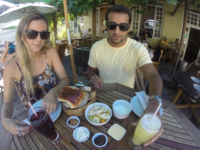 Já que ainda faríamos um passeio no JB, optamos por escolher um café da manhã pré montado, que no cardápio atende por “La Bicyclette”. Dessa maneira vem com: 1 croissant ou pain au chocolat, cesta de pães variados, manteiga, geléia artesanal, ricota, frutas da estação, iogurte com granola, suco e uma bebida quente. Com isso, o custo é de R$ 48,00.