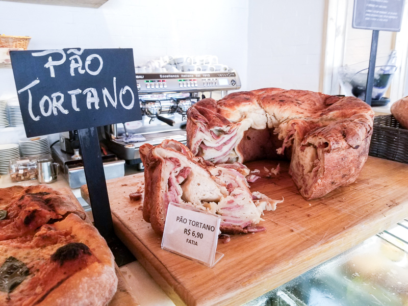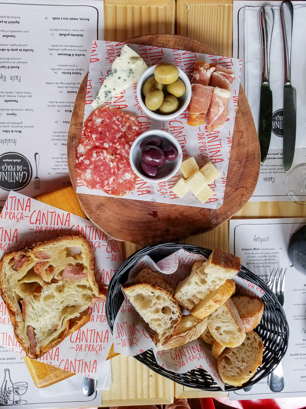 Começamos pedindo o pão Tortano (R$6,90 a fatia), que não está no cardápio mas você o perceberá lindamente no balcão do salão inferior, será quase que impossível resistir. Junto a ele chegou a Tábua Mista (R$39,00) com Grana Padano, Gorgonzola, Parma, Salame, Azeitona e Cesta de pães.