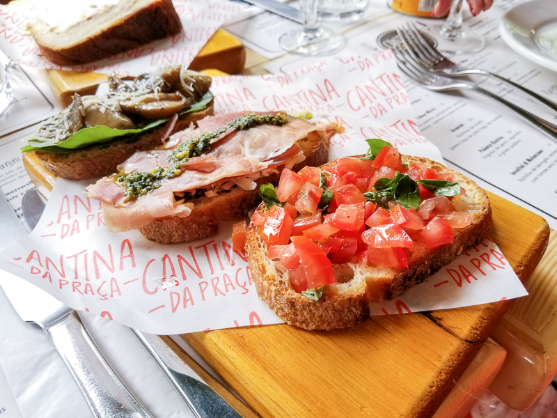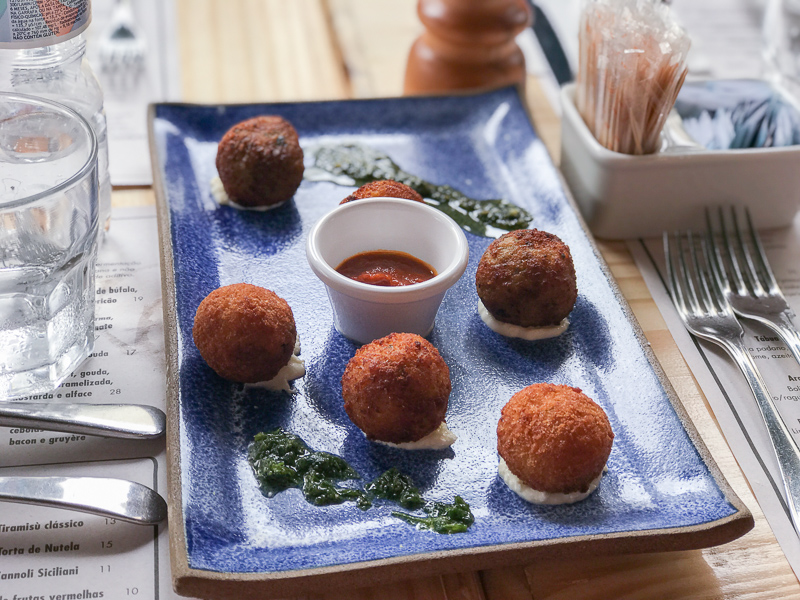 Ainda nas entradas provamos os clássicos e deliciosos Arancinis (R$26,00), que são bolinhos de risotto recheados com pesto, ragu de apto ou ragu de costela. Outro representante dos clássicos o trio de Bruschettas (R$26,00) nos sabores Cogumelos salteados; presunto de parma, queijo de cabra e pesto; e tomate e manjericão.