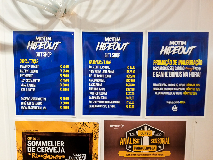 O Motim Hideout vai funcionar em esquema de autosserviço myTapp. Isso significa que o cliente terá um cartão com seu cadastro e poderá colocar quanto quiser de crédito. Ele mesmo se serve nas torneiras na quantidade que desejar e o consumo é descontado diretamente desse cartão (os preços terão por base 100ml).