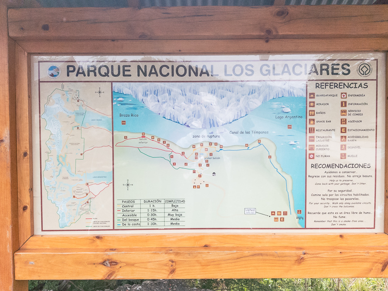 São 5 km de passarelas em volta do Glaciar Perito Moreno divididas em circuitos identificados por cores, então anote e grave bem essa dica. A partir do momento que a guia os deixar livres, faça o seguinte percurso: Amarelo – Vermelho – Amarelo – Azul, você perceberá ao visualizar os mapas disponíveis que dessa maneira fará um círculo certinho e retornará ao mesmo local de início, indo depois para circuito final que termina na praia, o de cor azul, o ponto de encontro. (O circuito verde não é interessante)