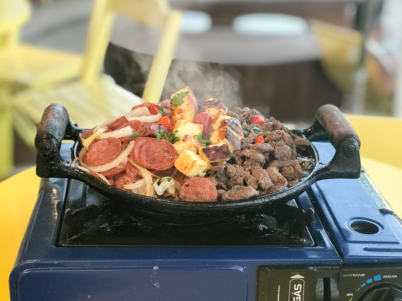 Pedimos para começar o Trio Boteco (R$74,90) com linguiça acebolada, queijo coalho e filé aperitivo, tudo isso na chapa que podia ser aquecido a qualquer momento. Bem servido e delicioso, clássicos dos botecos reunidos em um só petisco, curtimos.