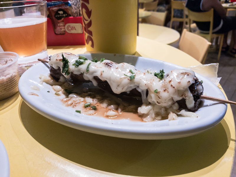 Em seguida, pedimos dois espetinhos: Queijo Coalho com melaço de cana (R$9,90) e Filé com queijo (R$18,90). Ambos muito bons e ótimas opções individuais.