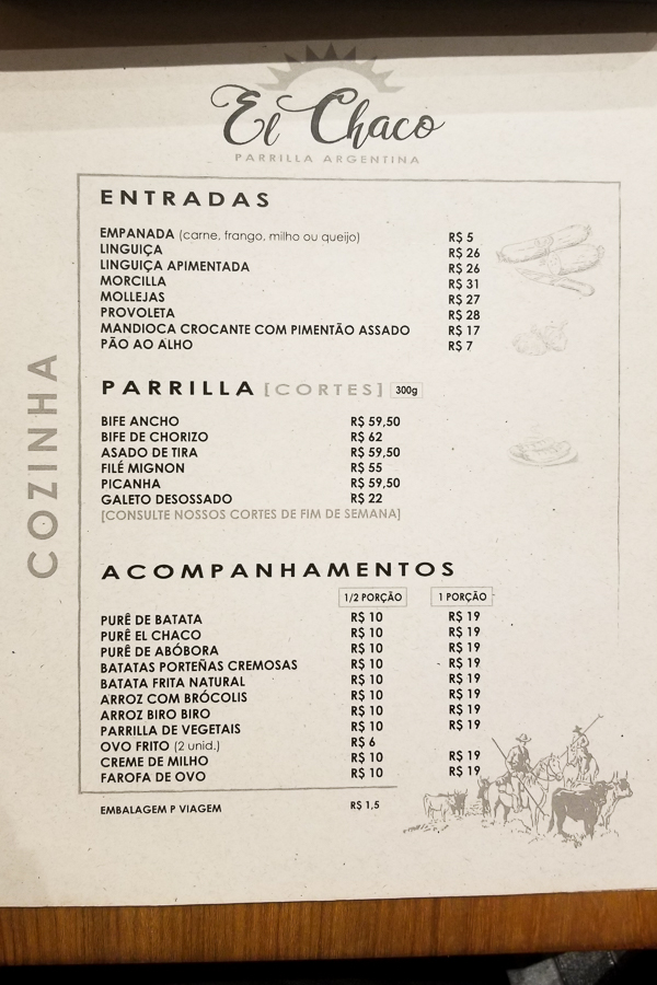 Menu do El Chaco Parrilla Argentina