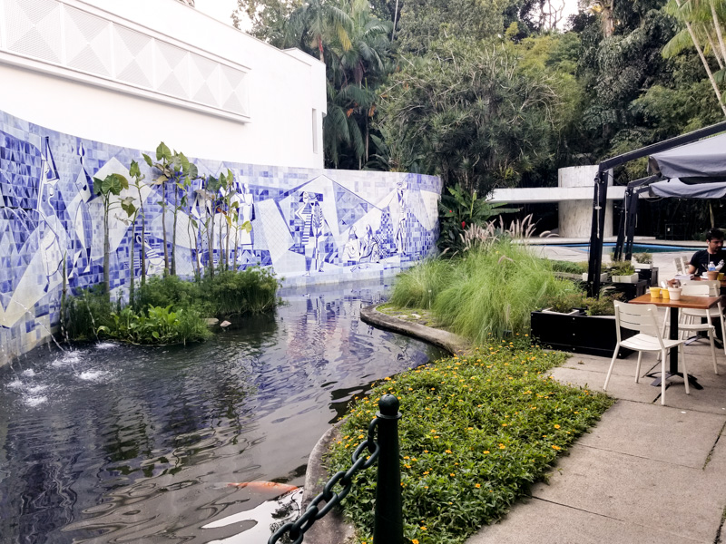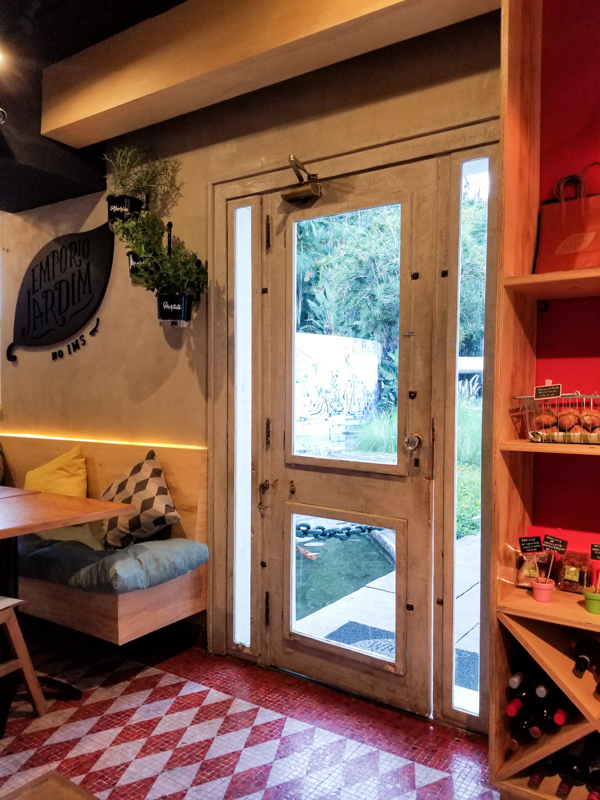 Mas para coroar seu passeio é lá que se encontra a mais recente unidade do Empório Jardim. O ambiente externo emoldurado por um pequeno lago com um painel de azulejos bem bonito de pano de fundo e rodeado por muito verde já conquista de cara quem chega por essa entrada.