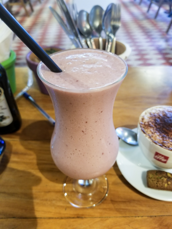 Smoothie de Frutas Vermelhas (R$15,90), bem gostoso, parece uma vitamina docinha.