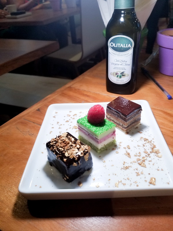 Trio Degustação (R$17,50), torta de chocolate belga com praline de avelã (dos Deuses! Deixe por último), torta de pistache com framboesa (Comece por ela!) e torta Ópera.