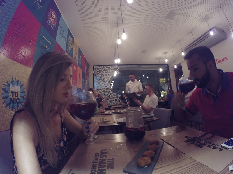 O restaurante oferece uma grande variedade de tapas. Para começar nós optamos pelas famosas “Las Croquetas de Jamón” (croquetes de jamón ao estilo espanhol com suave bechamel e molho alioli; 04 unid. R$28,50) muiiito saborosas, desmancham na boca de tão suave! E para acompanhar pedimos a famosa Sangria de Vinho Tinto (R$64,00) muito gostosa e refrescante!