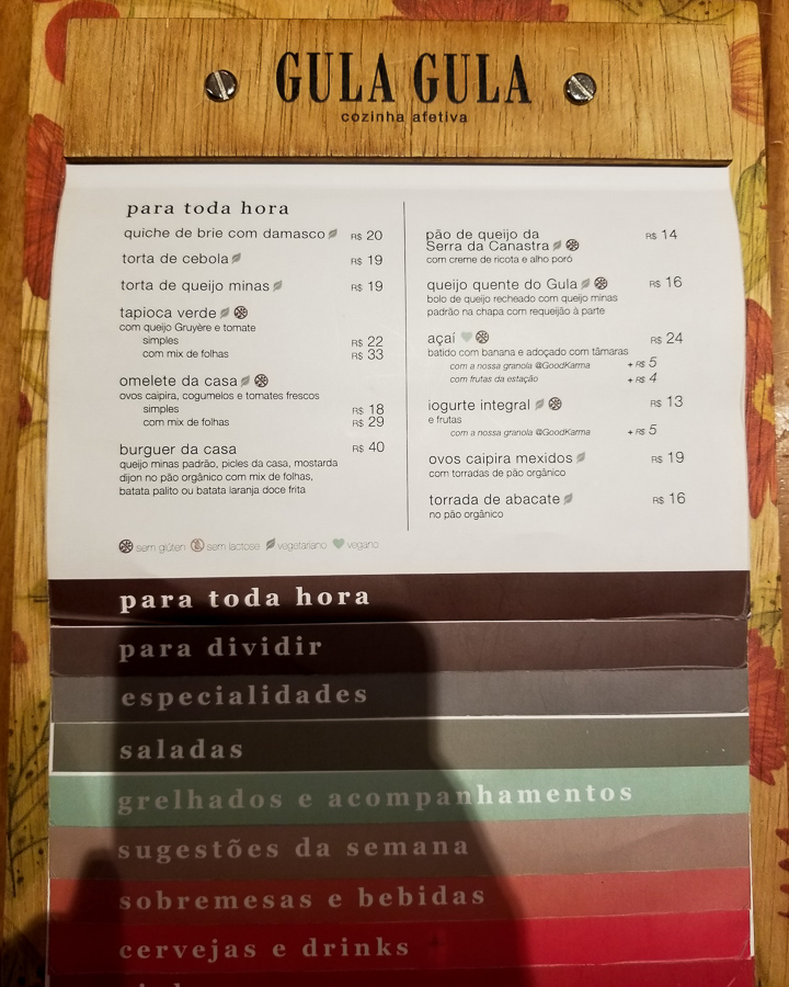 Chegamos ao Gula Gula do Shopping da Gávea por volta das 10 horas, hora que o shopping abre. O espaço está lindo, bem decorado, colorido e aconchegante. Escolhemos nossa mesa e a dividimos com um dos proprietários do restaurante, o Pedro. Assim podemos ouvir toda a história de dedicação, amor e carinho da família para com o restaurante e seus clientes. Muito legal.