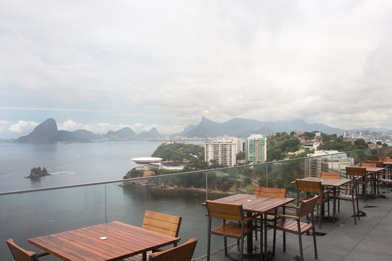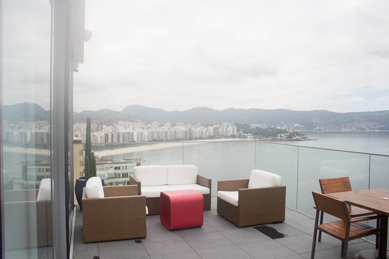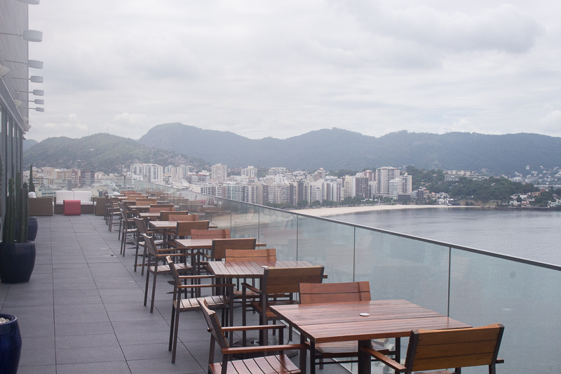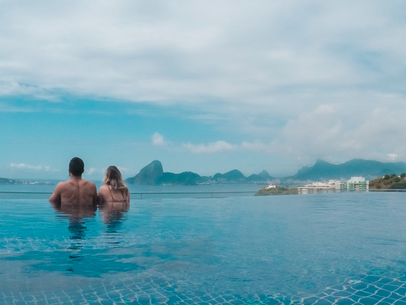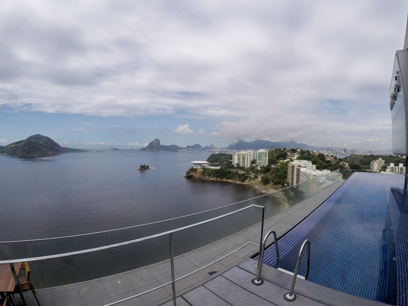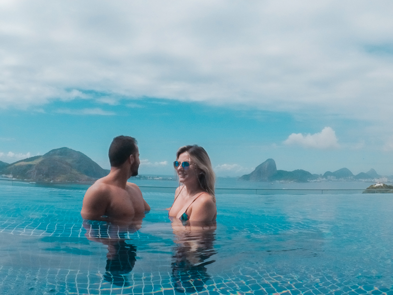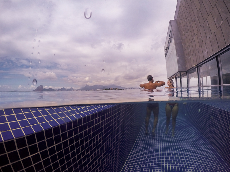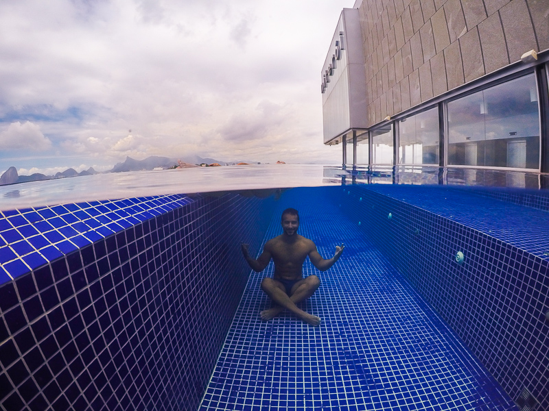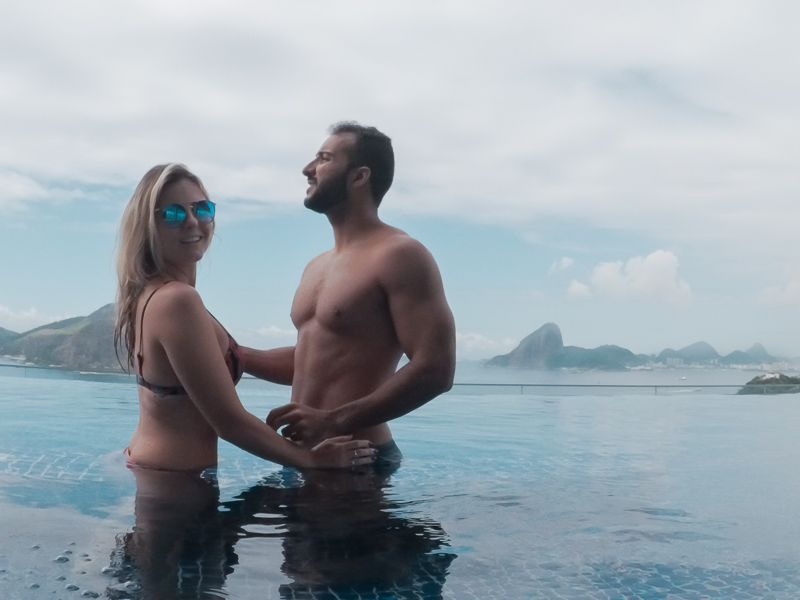 No terraço fica talvez o lugar mais cobiçado do hotel, a piscina com borda infinita de frente para o Pão de Açúcar. Ela é linda, uma delícia. Tanto que curtimos bastante quando saiu o sol.