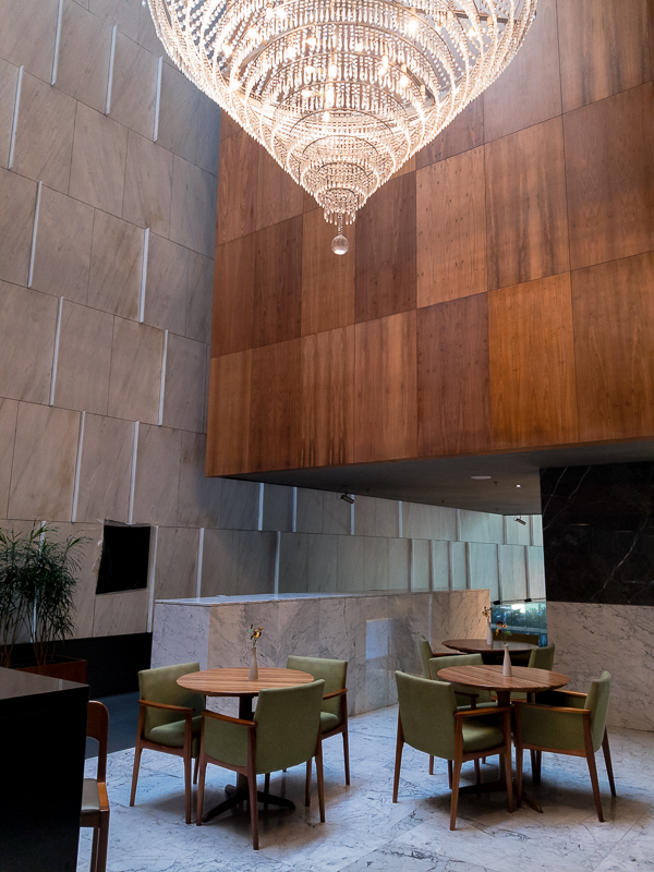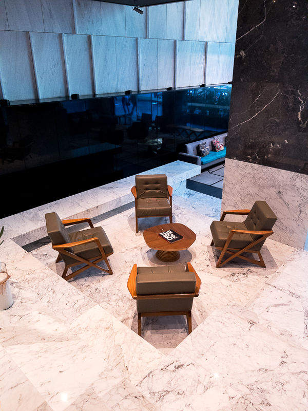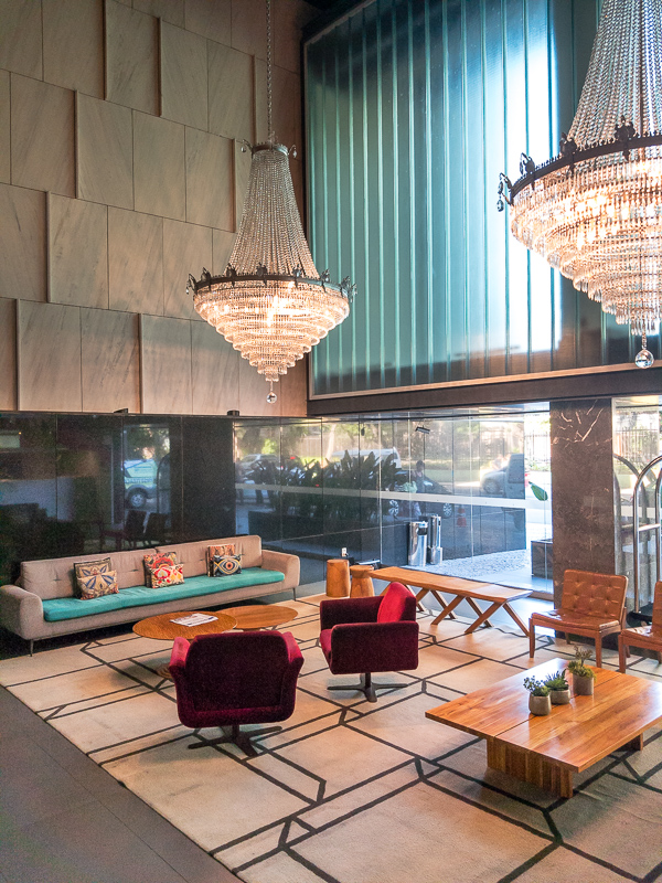 A chegada ao H Niterói Hotel já impressiona pelo seu lindo lobby. Pé direito alto, móveis design, lustres grandes, escadas em mármore branco, enfim, tudo contribui para que percebamos o tom modernista, sofisticado e tecnológico do local. Muito bonito, uma bela primeira impressão.