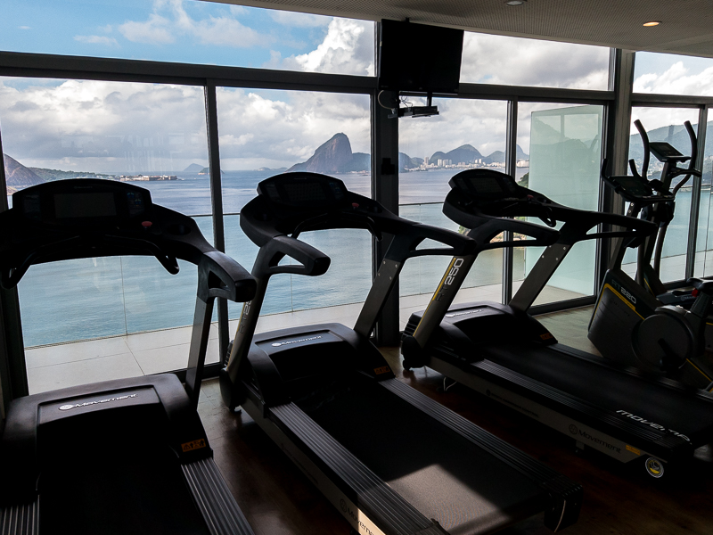Em relação as áreas de lazer para hóspedes, encontramos uma boa e completa academia com vista para o Pão de Açúcar e um terraço espetacular.