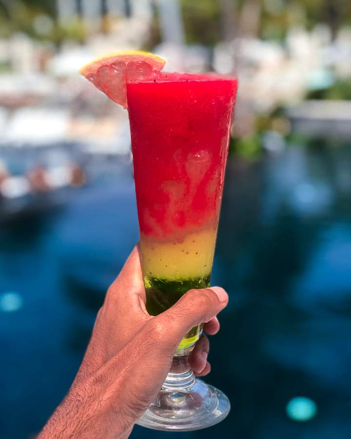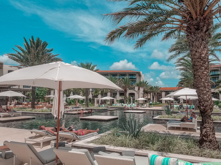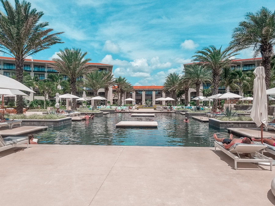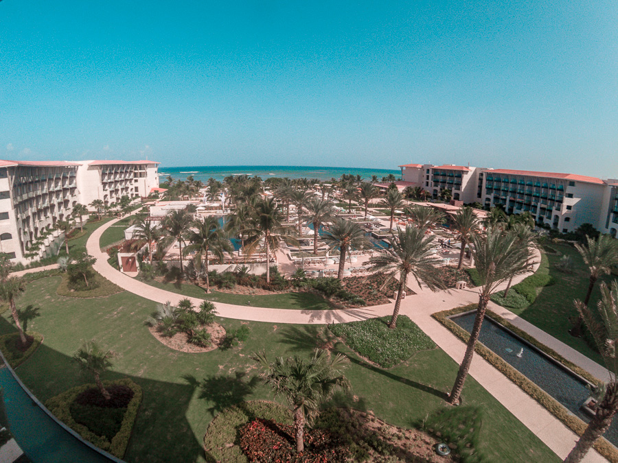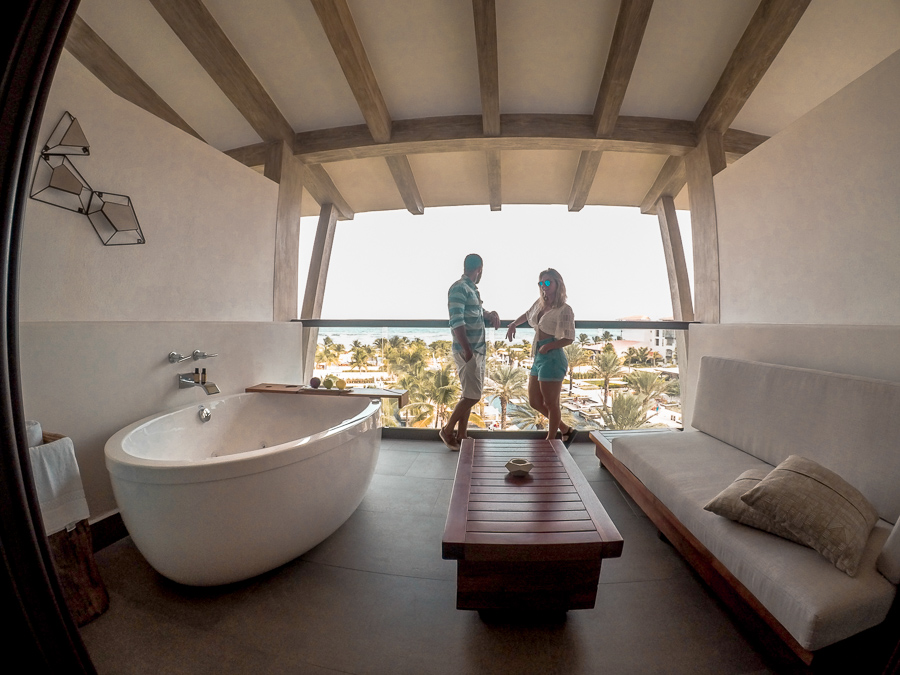 Nossa suíte está descrita como “PURE Alcoba Ocean View“, e o PURE no nome não é a toa. Ela é indicada especialmente para os alérgicos (Thiago agradeceu!) pois são adicionados além do rigoroso protocolo de limpeza usual outros 7 processos para reduzir a presença de potenciais irritantes. E a parte do “Ocean View” se refere a uma vista sem igual para o mar caribenho e toda estrutura de piscinas do hotel.