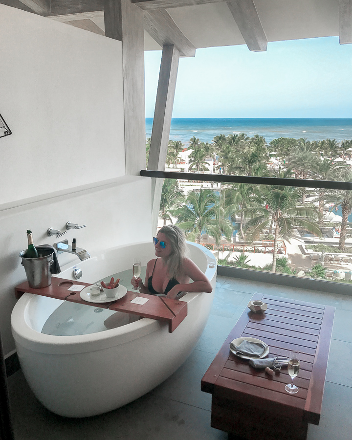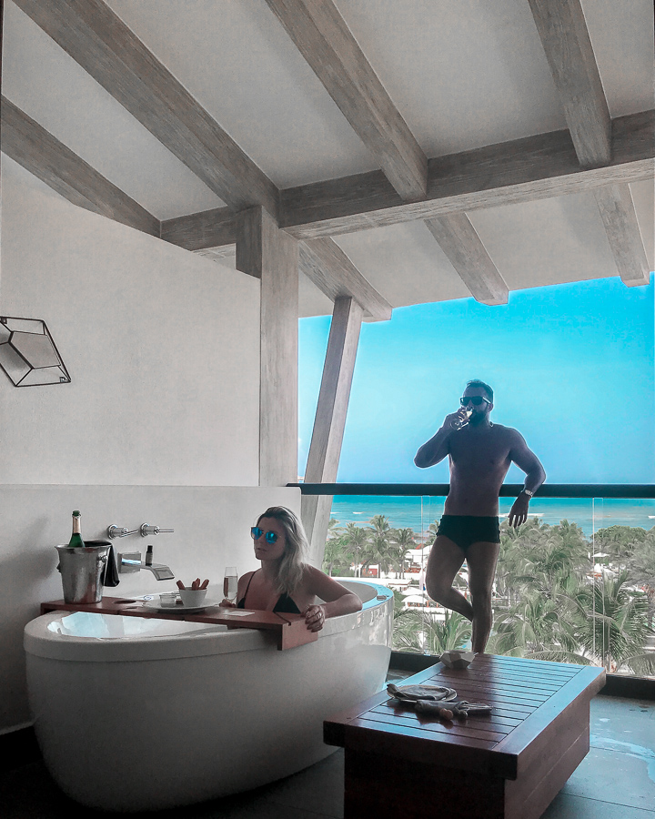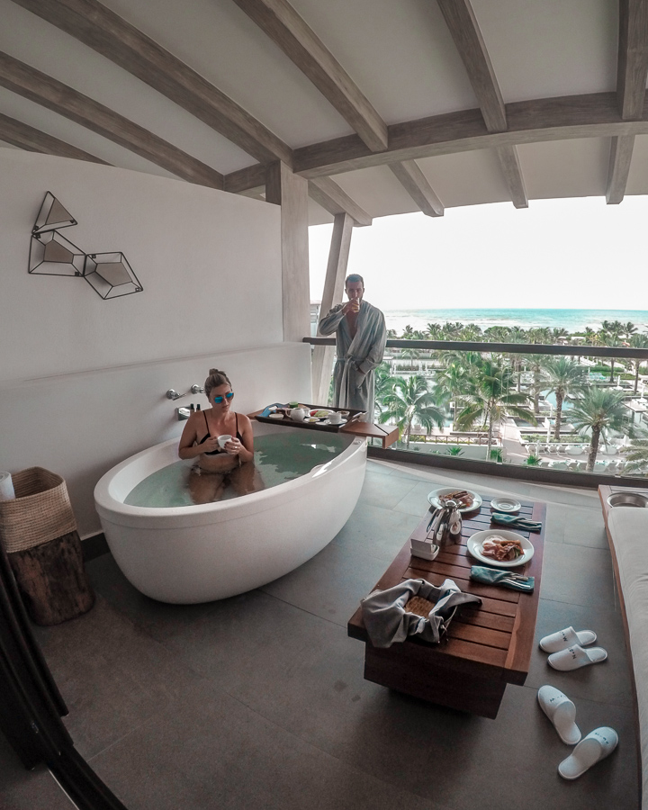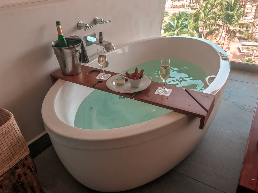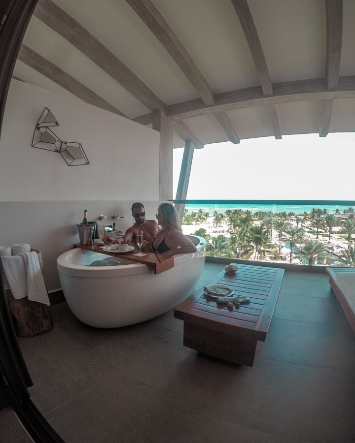 Em relação as amenidades do quarto, tudo o que está no mini bar é incluso no serviço: chocolates, castanhas, cafeteira e cápsulas nespresso etc. Assim como o frigobar também. E ambos são repostos todo dia ou a hora que você quiser. O serviço de quarto está incluso e opera 24 horas por dia! Muito maravilhoso isso. E não é um simples serviço não, tem de um tudo. Em um dos dias pedimos churros com espumante para apreciarmos o entardecer da banheira do nosso quarto por exemplo! Um luxo sem igual, não a toa é dos melhores hotéis em Playa del Carmen.