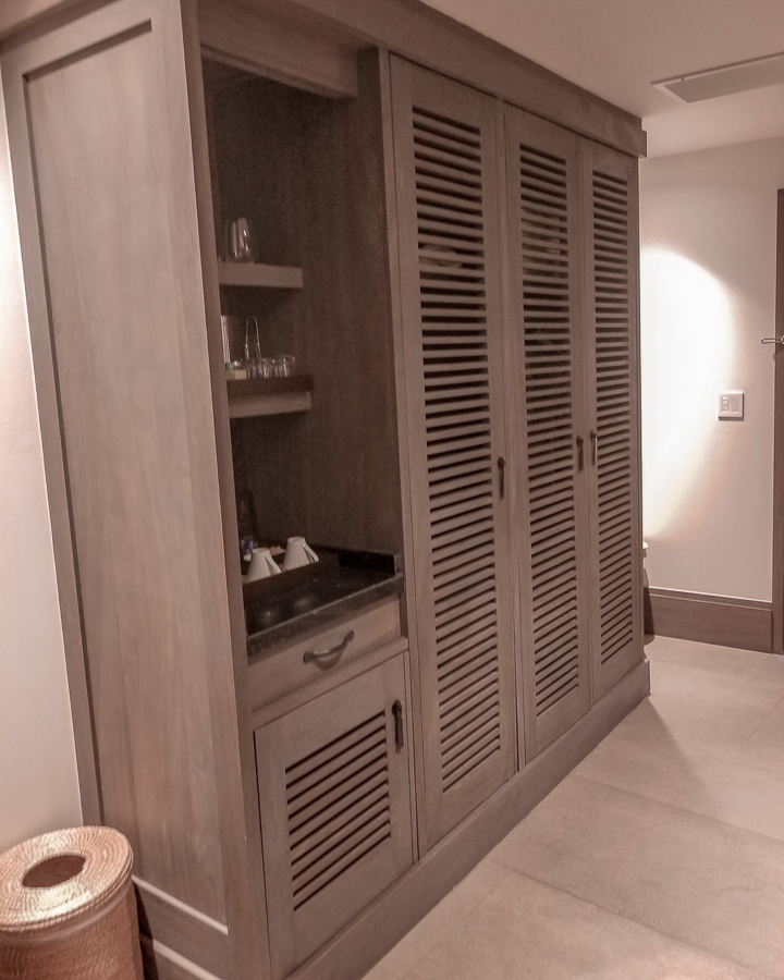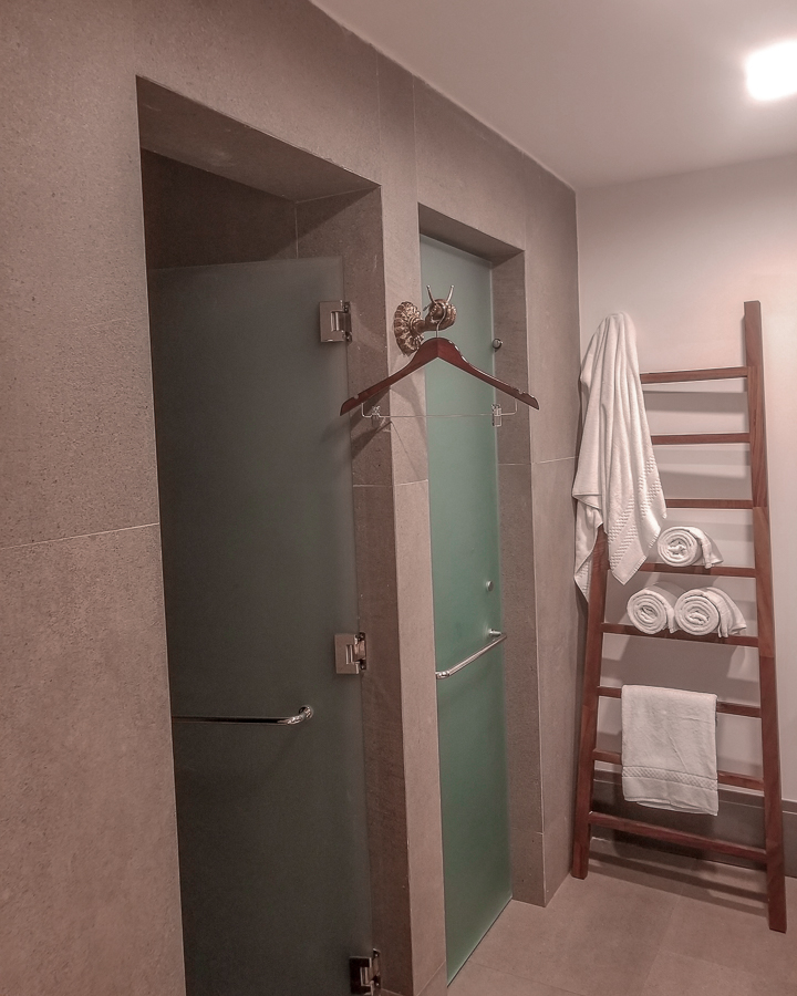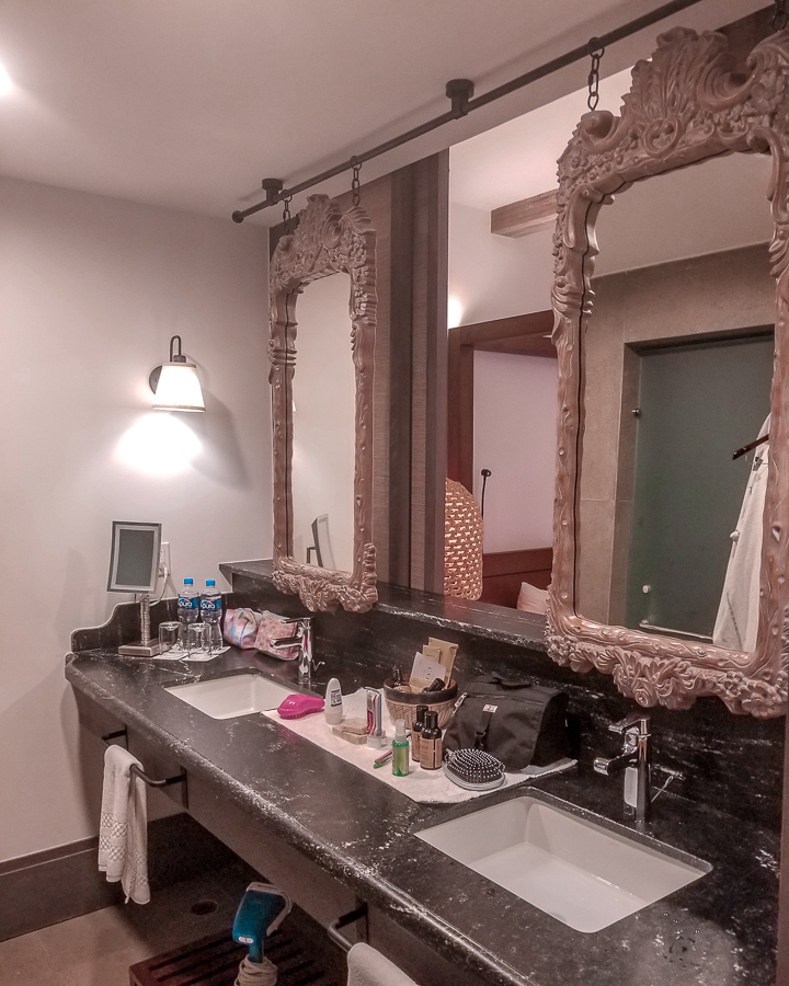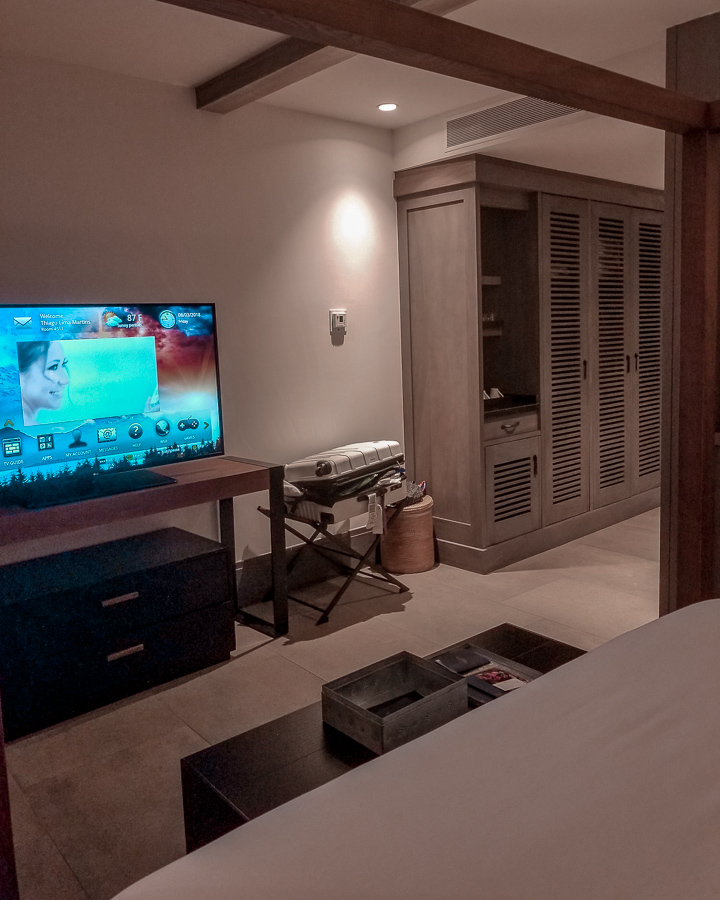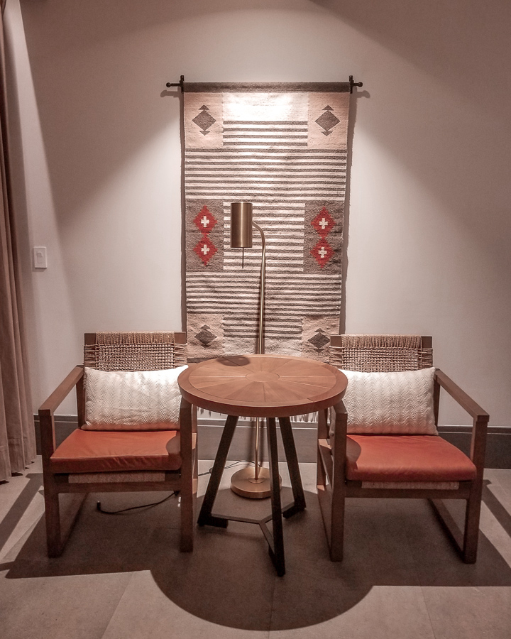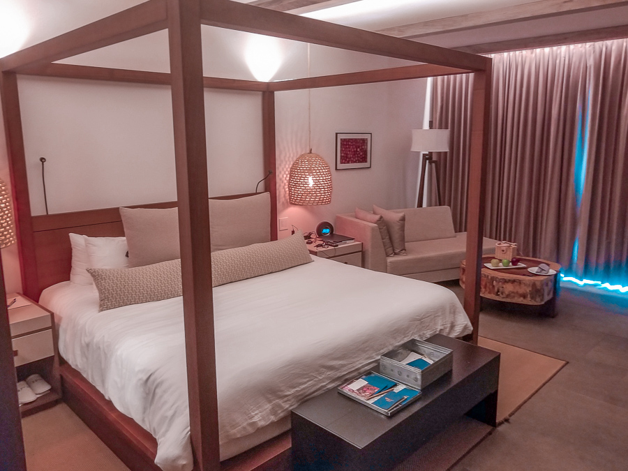 Ao entrar no quarto nos deparamos com o primeiro mimo: dois chapéus de palha que podem ser personalizados por um artista local, demais não é mesmo ? Seguindo pela suíte que tem cerca de 58 m² – sim, ela é bem espaçosa! – chegamos a parte principal onde tem uma cama king size com menu de travesseiros, Smart TV com com um “Boas Vindas” personalizado e NetFlix, uma poltrona, mesa para refeições e trabalho, e uma varanda.