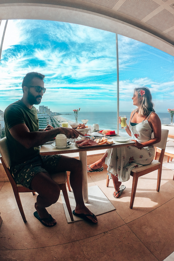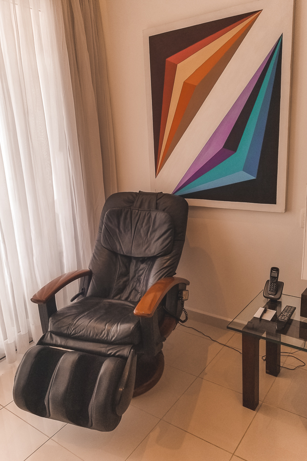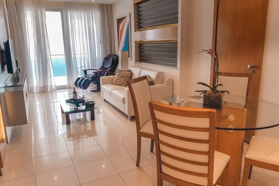 Nos hospedamos na suíte mais luxuosa do hotel, a Suíte Rio. Ao adentrar você irá se deparar com uma sala de estar completa e ampla, que estende-se até a varanda mobiliada e com uma vista incrível da orla inteira. Ainda na sala temos mesa de jantar, sofá, TV, poltrona massageadora (uma maravilha!), máquina de café expresso e mais. Bem completa!