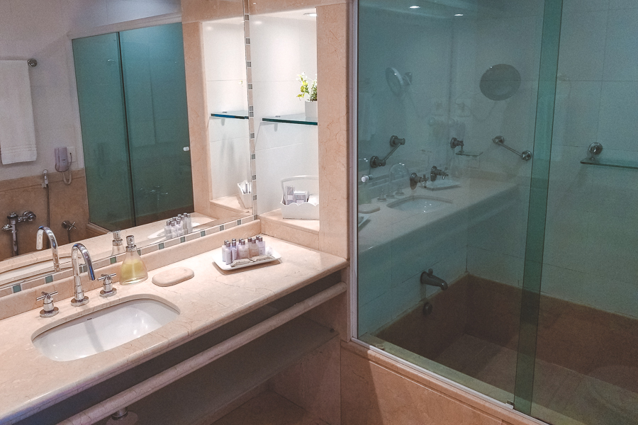 Claro que não podemos deixar de mostrar o banheiro. Todo feito de mármore. Apesar de ter uma arquitetura antiga, é bonito, conta com uma bela ducha e amenidades para banho completas da marca de luxo Trussardi.