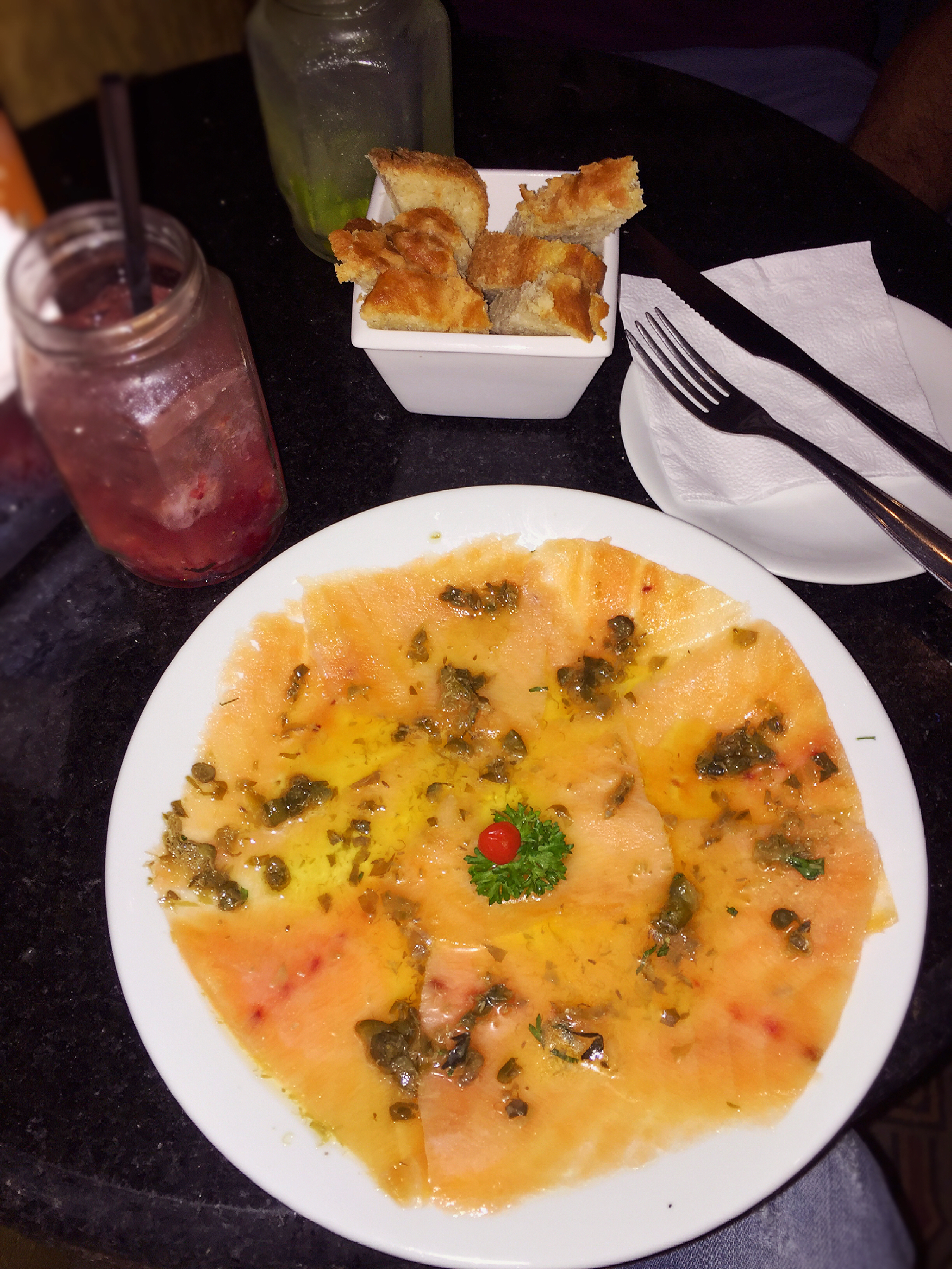 Bom para os esfomeados que nem nós (hahaha), no cardápio tem opções de petiscos, pratos, saladas e especialidades Jungle. Optamos em pedir o “Carpaccio de Salmão Gravlax” R$35,00, servido com aneto, salsa verde e cestinha de focaccia. Achamos bem saboroso o prato, além disso a focaccia veio bem quentinhaa! Recomendamos 😉 E para acompanhar pedimos a dose dupla de caipirinha (elas são servidas em potes de vidro, o que dá um charme a mais!!) no valor de R$22,00.