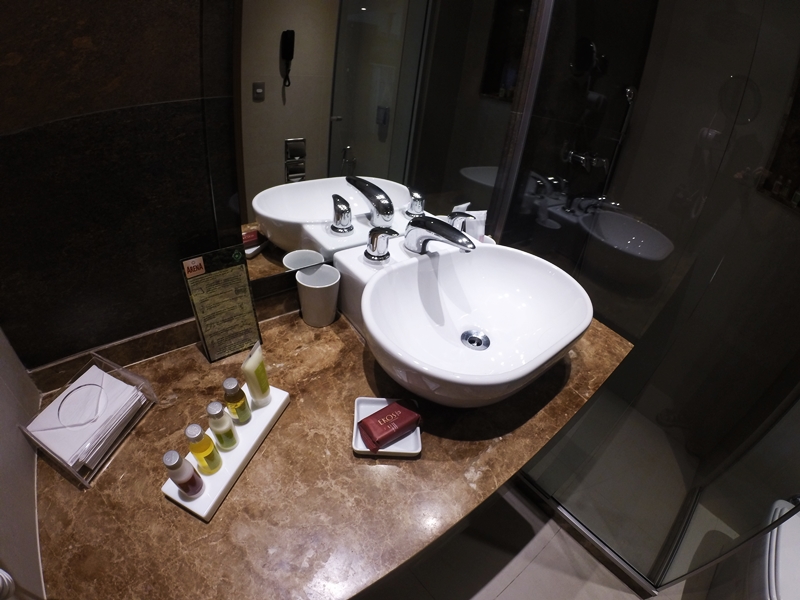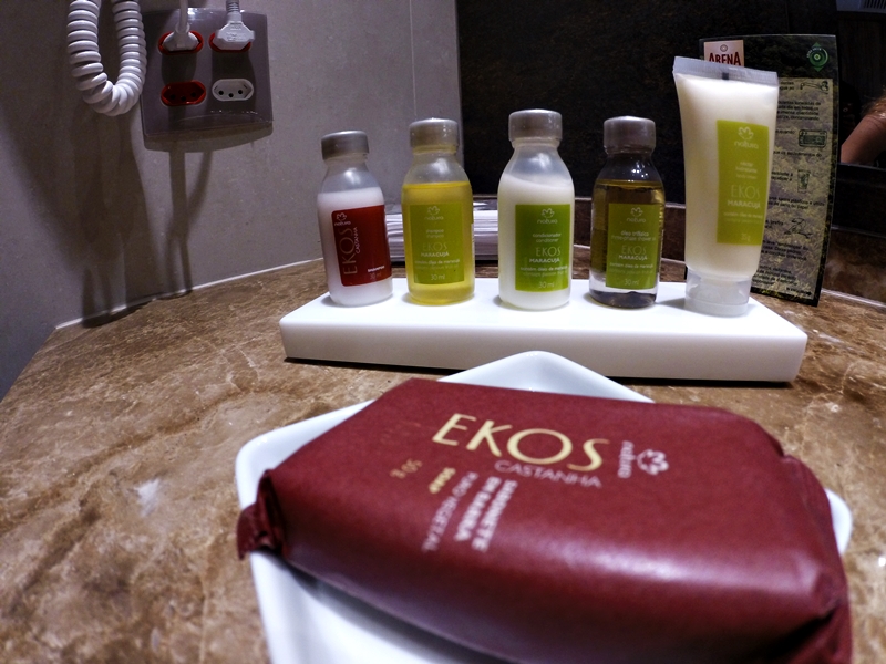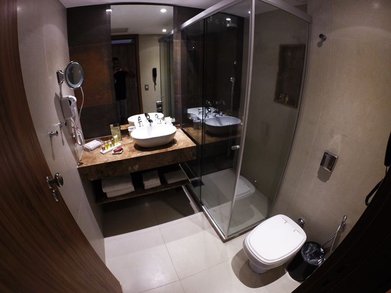 A suíte é muito bem decorada e linda (um clean chique, sim, também damos pitacos sobre a decoração! ahahahha), assim como o banheiro, moderno e com um bom tamanho é equipado com com espelho iluminador e lupa, conta com secador de cabelos e uma ducha maravilhosa (um ponto a mais para o Hotel, um bom banho faz a diferença!). As amenidades oferecidas são da marca Natura™ e as sandálias da Ipanema™.