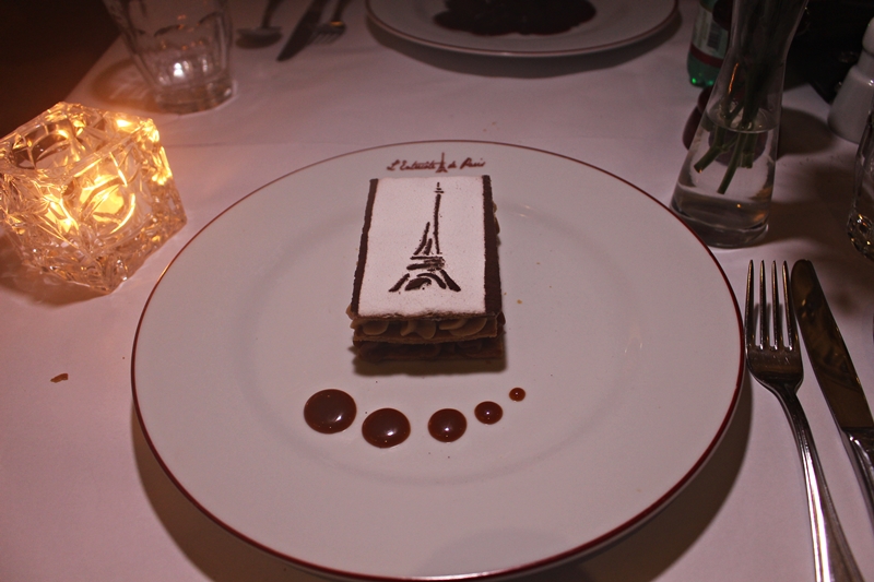 Antes da estrela da noite provamos o Mille-Feuilles Eiffel de Doce de Leite. A massa folhada é produzida no dia, fininha, leve e suave. Além de deliciosa, essa é a mais fotogênica das sobremesas, uma obra de arte.