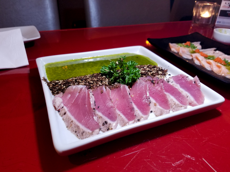 Sashimi de Atum com farofa de Funghi (R$28,90). Gente, esse nós super recomendamos. A farofa de funghi é muito boa, comemos ela pura até.O atum veio no ponto e delicioso também. O azeite complementa tudo e faz a farofa grudar no atum, maravilha.