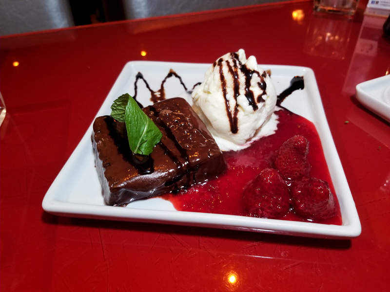 Brownie com sorvete e glaze de Frutas Vermelhas (R$28,90), bem servida, bonita e saborosa. As frutas vermelhas quebram o doce do brownie e tudo fica equilibrado.