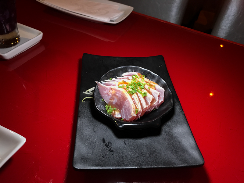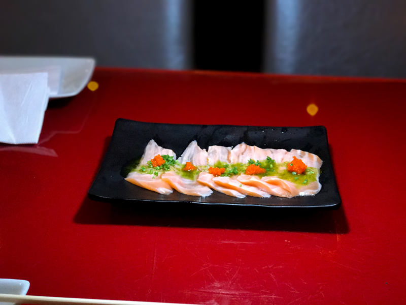 Barriga de Salmão Maçaricada (R$19,90), acompanha azeite de ervas e ovas. Uma delícia.
