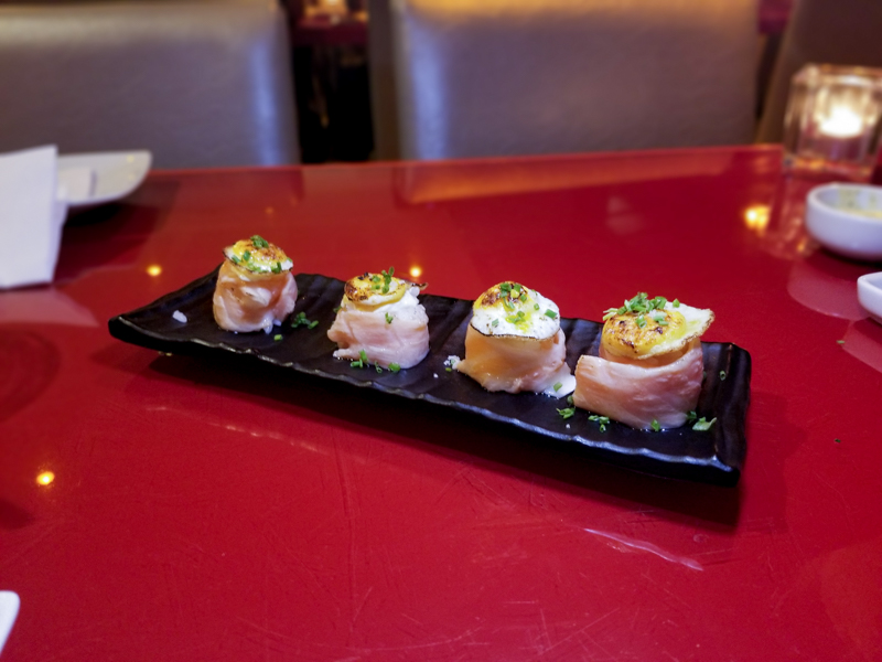 Salmão maçaricado com ovo de codorna (4 unidades por R$26,90), adoramos esse! Os ovinhos em cima são estrelados e ainda tem flor de sal finalizando.