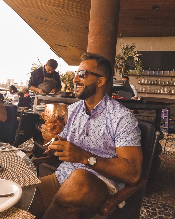 Além da vista vale ressaltar a arquitetura e decoração de muito bom gosto. Pé direito alto, adega imponente e muito espaço. Os tons amadeirados deixam tudo mais aconchegante e confortável também. Sem dúvidas, uma bela experiência.