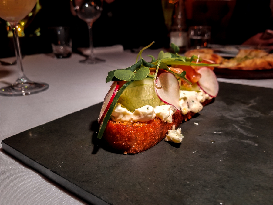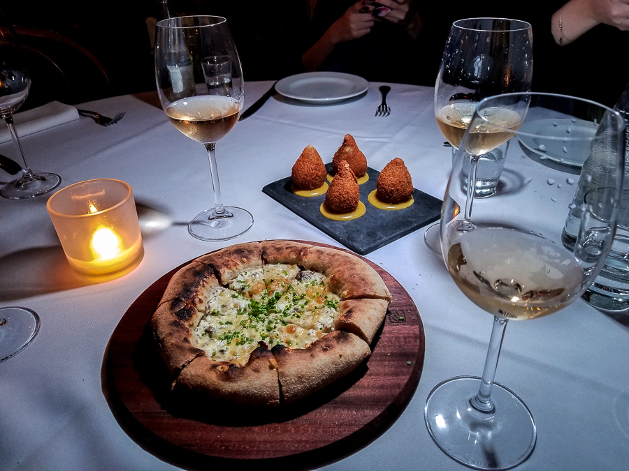 Começamos pedindo um clássico do Bagatelle carioca: Les “Coxinhas” de Janine. Mini coxinhas de galeto caipira, cogumelo paris e molho bernaise (R$39). Uma delícia. Sugiro pedir junto as coxinhas a Pizza à la Truffle, feita com massa de fermentação natural, creme fraîche trufado e um toque defumado (R$43). Duas belas maneiras de começar seu jantar ou sua noitada. Outra sugestão que nós adoramos foi o Salmão Gravlax Toast, fei com pão sourdough, salmão gravlax, creme fraîche, pepino e rúcula (R$56).