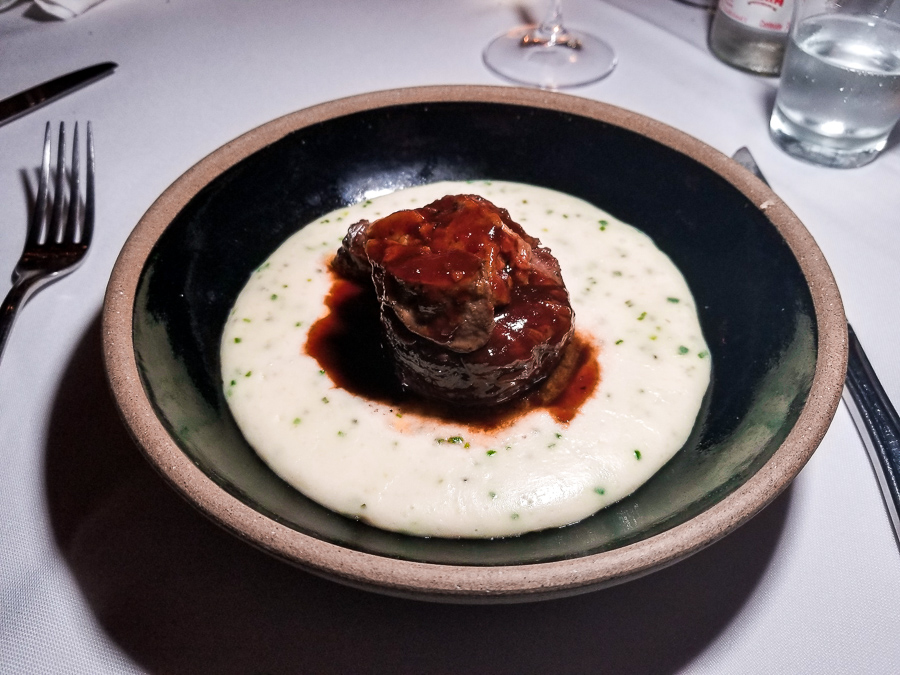 O Bagatelle tem forte influência francesa (e mediterrânea também), sendo assim estávamos ansiosos pelos pratos principais. Pedimos o Tournedos Rossini, um filé mignon coroado com escalope de foie gras, purê de batatas com ervas e jus bordelaise (R$102). O ponto estava perfeito, o purê maravilhoso e o foir gras realmente coroou o prato!