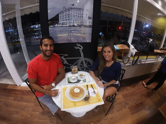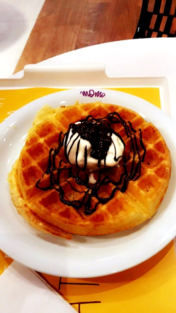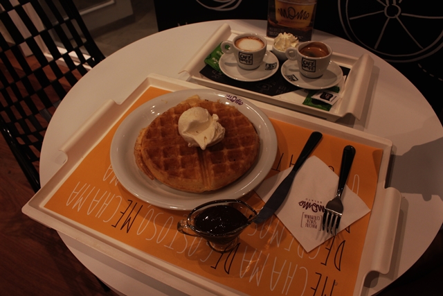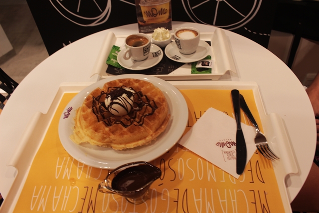 A Momo também serve outras tentações e dentre as muitas existentes optamos pelo famoso waffle com Gelato por R$26,00 para dividirmos e cada um escolheu um café da casa para acompanhar, outra atração a parte da loja, diversos tipos de cafés e bebidas com café (café orgânico, café com fé!), vale a pena uma passadinha lá para experimentar. Escolhemos um Espresso com Panna (chantily) R$8,00 e um Espresso Macchiato R$8,00. O waffle estava incrível e a calda quente servida a parte para incrementar faz toda a diferença, ficou delicioso!!