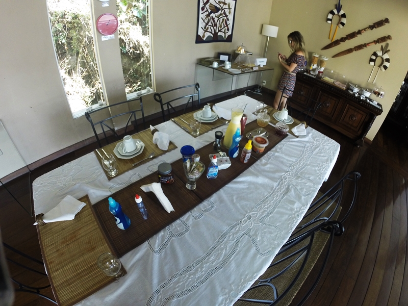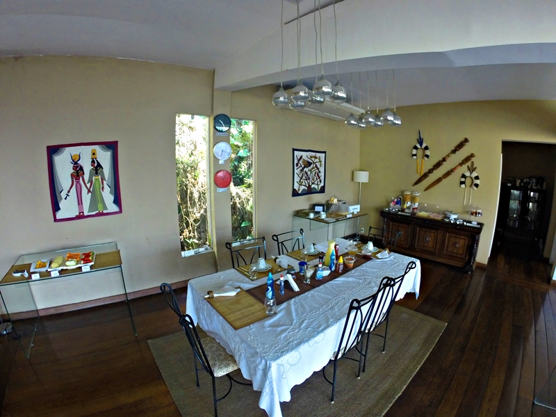 Passando para o ambiente seguinte, nos deparamos com o salão principal, um ambiente com decoração de muito bom gosto, variando do clássico ao contemporâneo. Esta também é uma área de uso comum dos hóspedes, onde está localizada a mesa em que são realizadas as refeições. Foi nessa mesa em que tomamos nosso café da manhã, bem caseiro e gostoso com frutas, pães, ovos mexidos e etc .. ah e um suco de maracujá ao leite, DIVINO!!