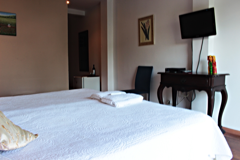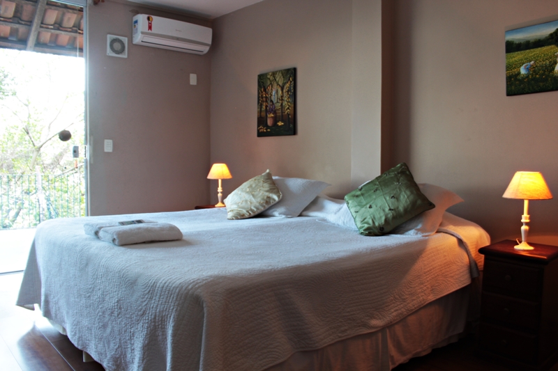 Finalizamos o tour pelo casarão em nosso quarto, a suite standard, muito arrumadinha, limpinha e por sinal bem cheirosa. A suíte possuí uma cama King Size, ar condicionado frio/ quente, um closet equipado com cofre digital, um espaçoso banheiro com secador de cabelo, ducha e amenities, wifi (gratuito), TV de LCD, frigobar e berço (opcional). Além disso, fica localizada numa área bem tranquila e silenciosa, onde escutávamos apenas o canto dos passáros! Nós amamos!!