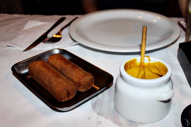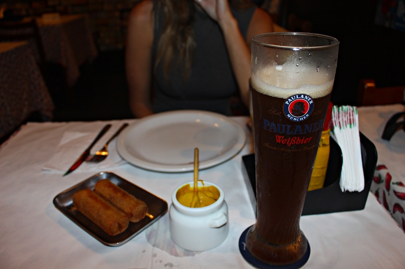Começamos com os Clássicos Croquetes Alemãs acompanhado por uma deliciosa mostarda. Estavam muito bons mesmo, bem crocantes por fora e saborosos por dentro! A porção vem dois croquetes e custa R$12,90. Para beber optamos por Água e uma Paulaner Dunkel, em torno de R$25,00 a Paulaner de 500ml servido numa linda Tulipa gigante!