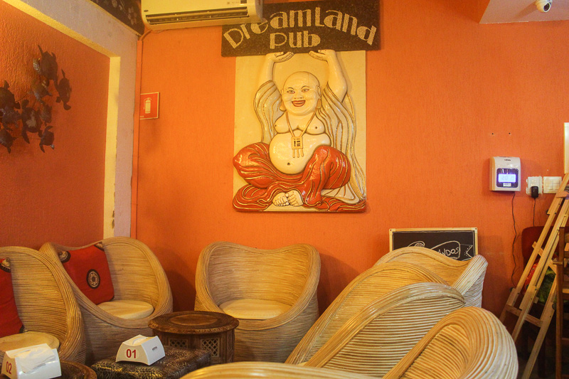 Chegamos por volta das 20 horas no Dream Land PUB. Ao entrar no estabelecimento nos deparamos com um grande salão repleto de mesas e sofás ao redor (mais exclusivos). O ambiente é decorado com tema da Ilha de Bali, tem uma iluminação mais baixa e bastante aconchegante.