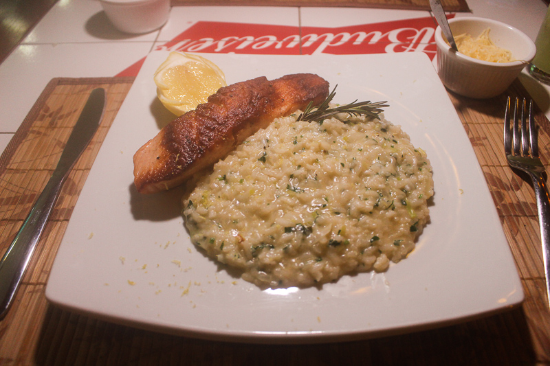 Para o prato principal optamos por Risoto de Camarão e Salmão Grelhado com Risoto Siciliano. Nossos pratos estava excelentes, muito bem executados. Nós adoramos.