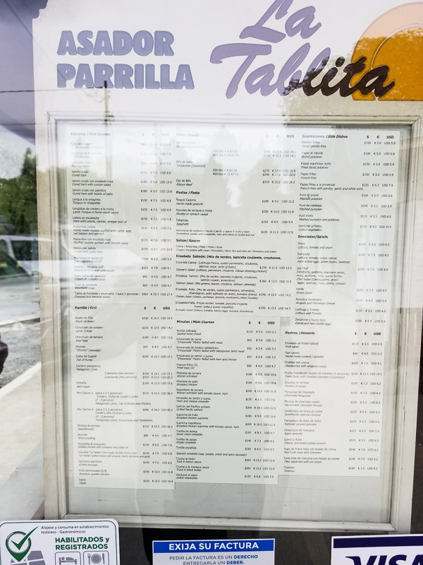 Assim como em toda a Argentina, os restaurantes em El Calafate cobram o “cubierto”, a taxa dos talheres (para gente é uma desculpa para garantir o serviço que não está incluso, ou seja, além do cubierto tem a gorjeta do garçom que fica a seu critério), ela é fixa, inclui um couvert e varia dependendo do restaurante. No La Tablita custou ARS 50,00 (ARS = Pesos Argentinos) por pessoa e eles serviram pães com uma pastinha que estavam bem saborosos.
