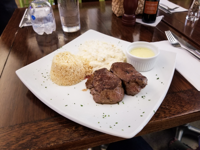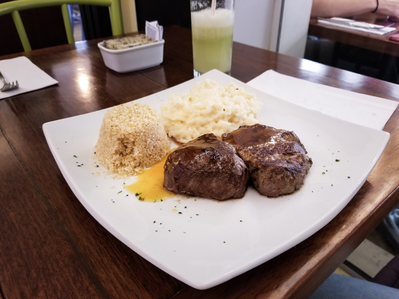Thiago optou por montar seu prato que segue a seguinte regra: 1 Proteína + 1 Molho + 2 Acompanhamentos. E o que dita o preço é a proteína escolhida. No fim ficou assim: Filé Mignon ao Molho de Mostarda com Arroz a Piamontese e Farofa Crocante por R$ 49,00. Mais uma vez o ponto da carne merece elogios e a farofa de panko é maravilhosa.