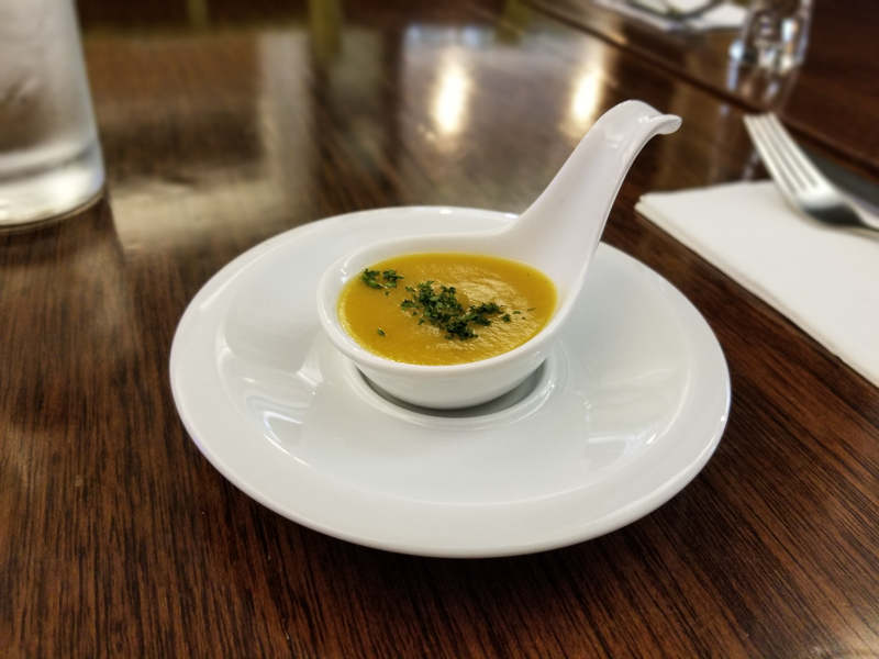Antes de pedirmos qualquer prato chegou a nossa mesa um amuse bouche muito gostoso, uma sopa de abóbora deliciosa, cortesia da casa para todos os clientes abrirem o apetite.