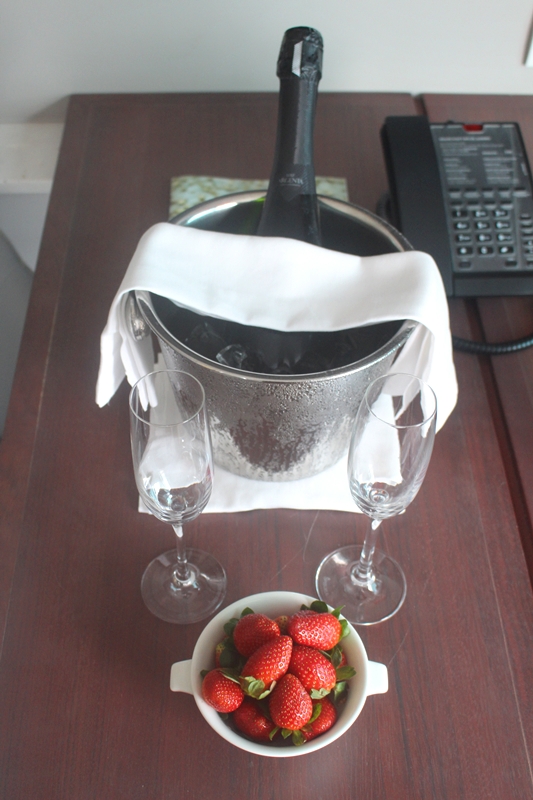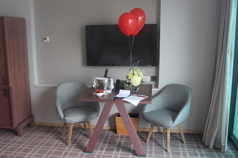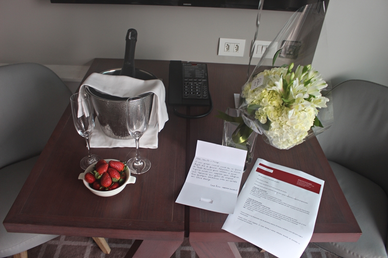 Entramos no quarto e nos deparamos com os mimos carinhosos que fazem a diferença e elevam o nível do serviço a outro patamar. Balões vermelhos, espumante com morangos, cartinha escrita a mão e um buquê de flores brancas nos esperavam demonstrando todo carinho dos colaboradores e customização do serviço.