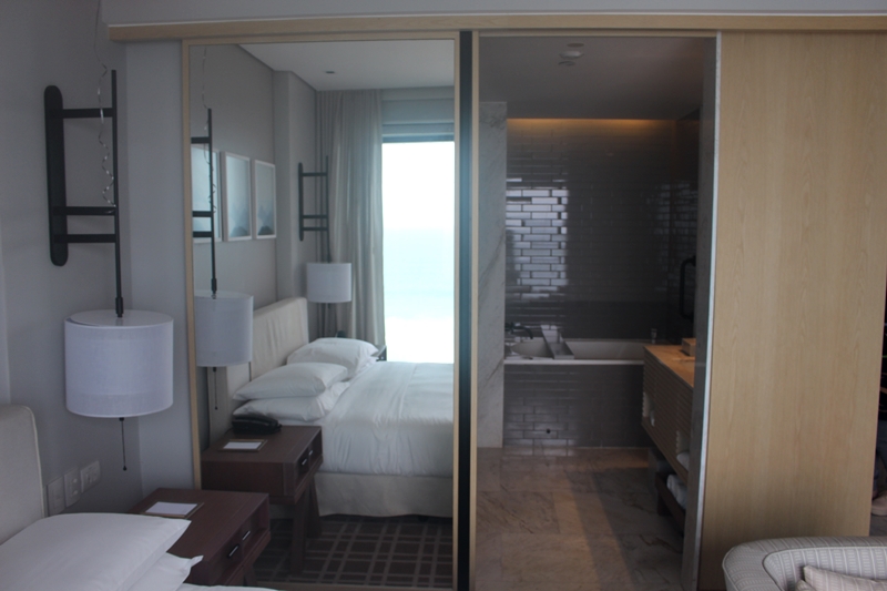 Nosso quarto ficava de frente para a praia a da Barra, um visual deslumbrante, assim como o quarto em si. Com decoração clean em tons claros, nos conquistou de cara! Adoramos esse luxo clean, sem extravagância.