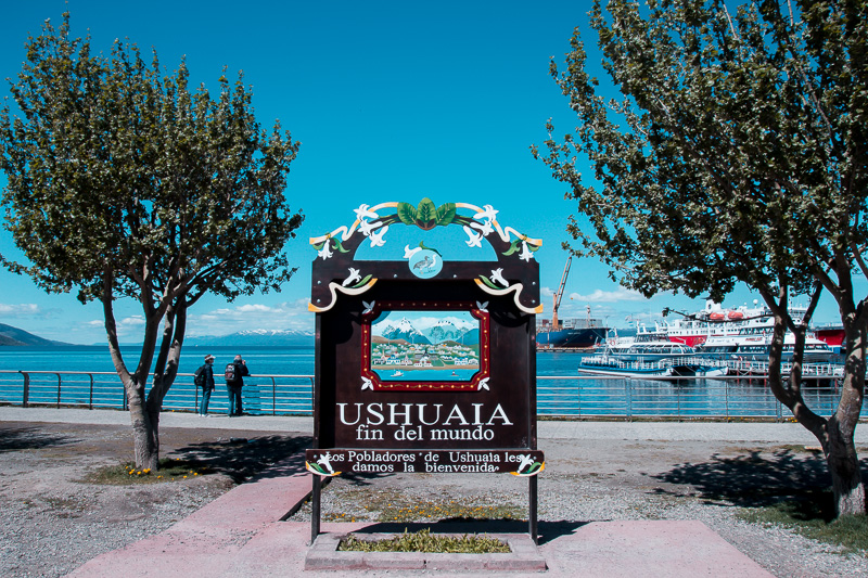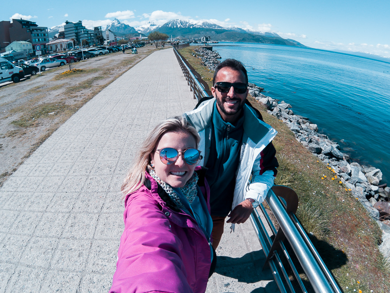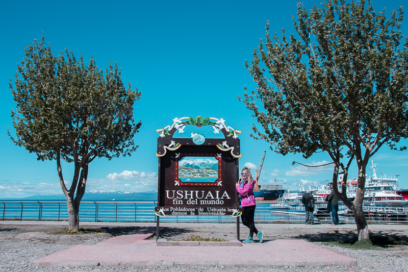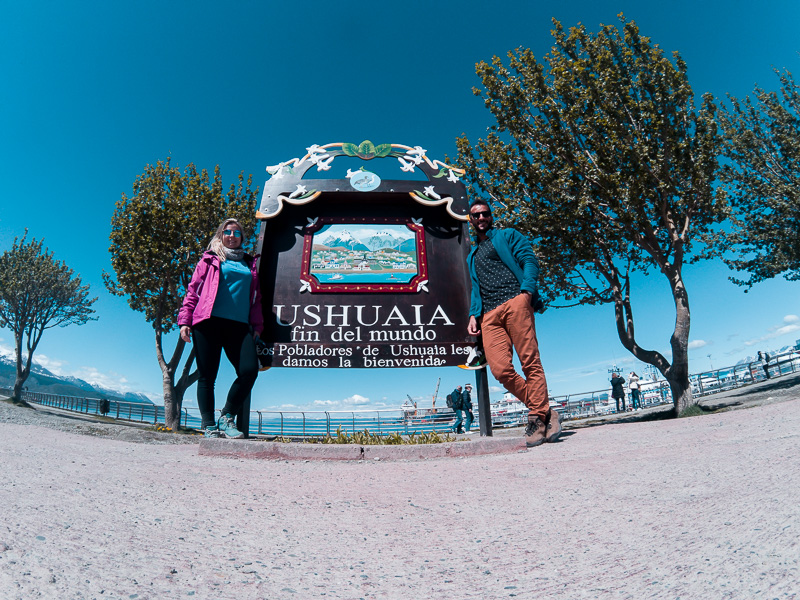 Dada a hora e local combinado, bem no porto em um estacionamento super fácil de achar e ao lado da placa do Fim Do Mundo embarcamos na van.