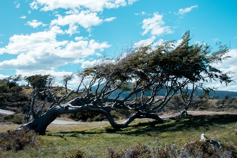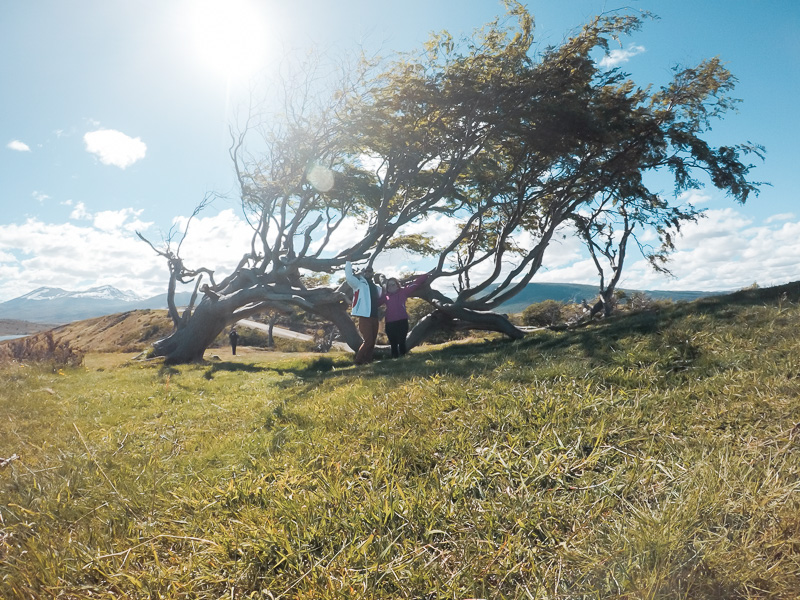 Fomos conhecer de perto as tão faladas Árvores Bandeira, aquelas que crescem de lado, quase que deitadas. Apesar do formato e crescimento curioso elas são saudáveis. E só ficam nesse formato por conta dos fortes e interruptos ventos patagônicos.