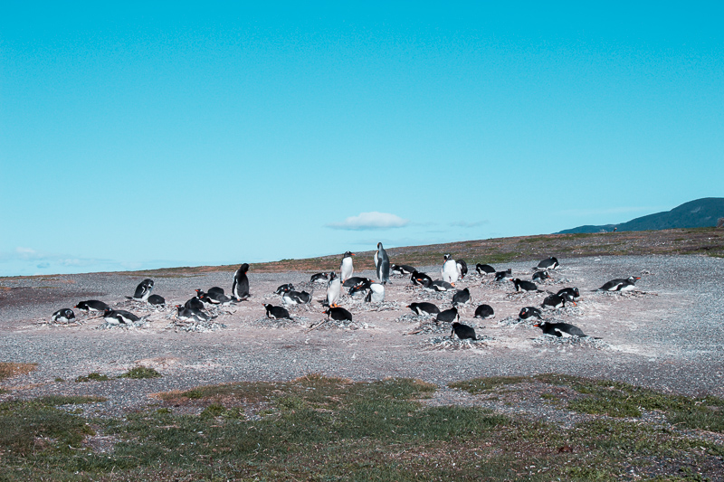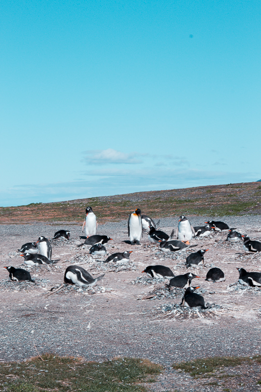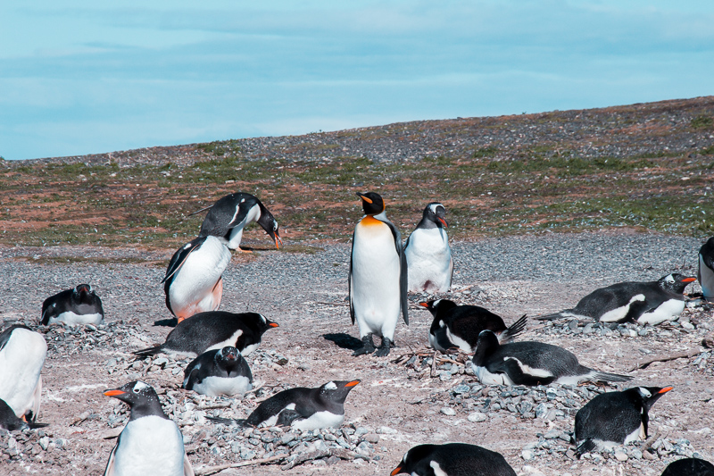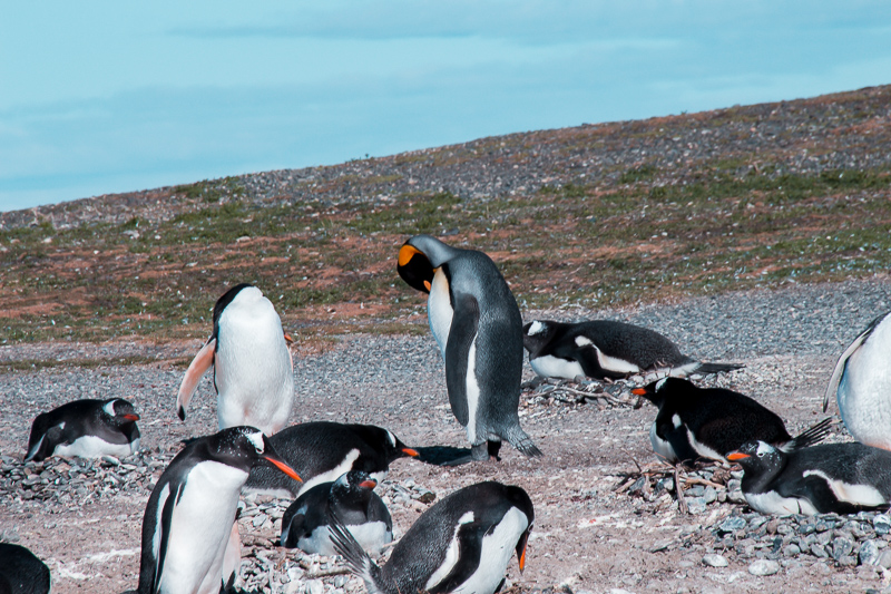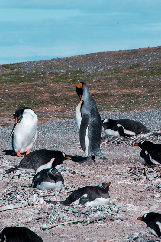 Na Pinguinera Terrestre você consegue observar até 2 espécies de pinguins, um continental (Papúase de Magallanes) e outro antártico (Gentoo). E para a nossa sorte avistamos uma terceira espécie, muito raro de acontecer. Vimos o Pinguim Rei, o segundo maior pinguim do mundo. Muito conhecido no Brasil por estampar a logomarca de uma cerveja, a Antártica. Ele é lindo e estava junto da colônia de outros pinguins antárticos.